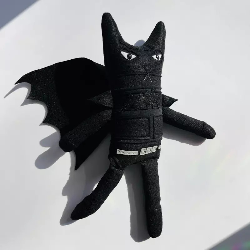 *Batcat is being sold at a discounted rate (normally $75) for an imperfection. All of my cats have SOME imperfections because they’re made by me alone using my hands and a sewing machine, but this one seemed too large (in my opinion, anyway) to sell at normal value. You’ll notice on Batcat’s right side that his underroos are misaligned (shown in last picture of the listing). This occurred when the fabric slipped during sewing due to the machine not liking very thick layers and arm pads, and everything was too thick to successfully seam rip without damaging the cat. It’s not noticeable from the front, only the side… and perhaps only by me… but there you have it.