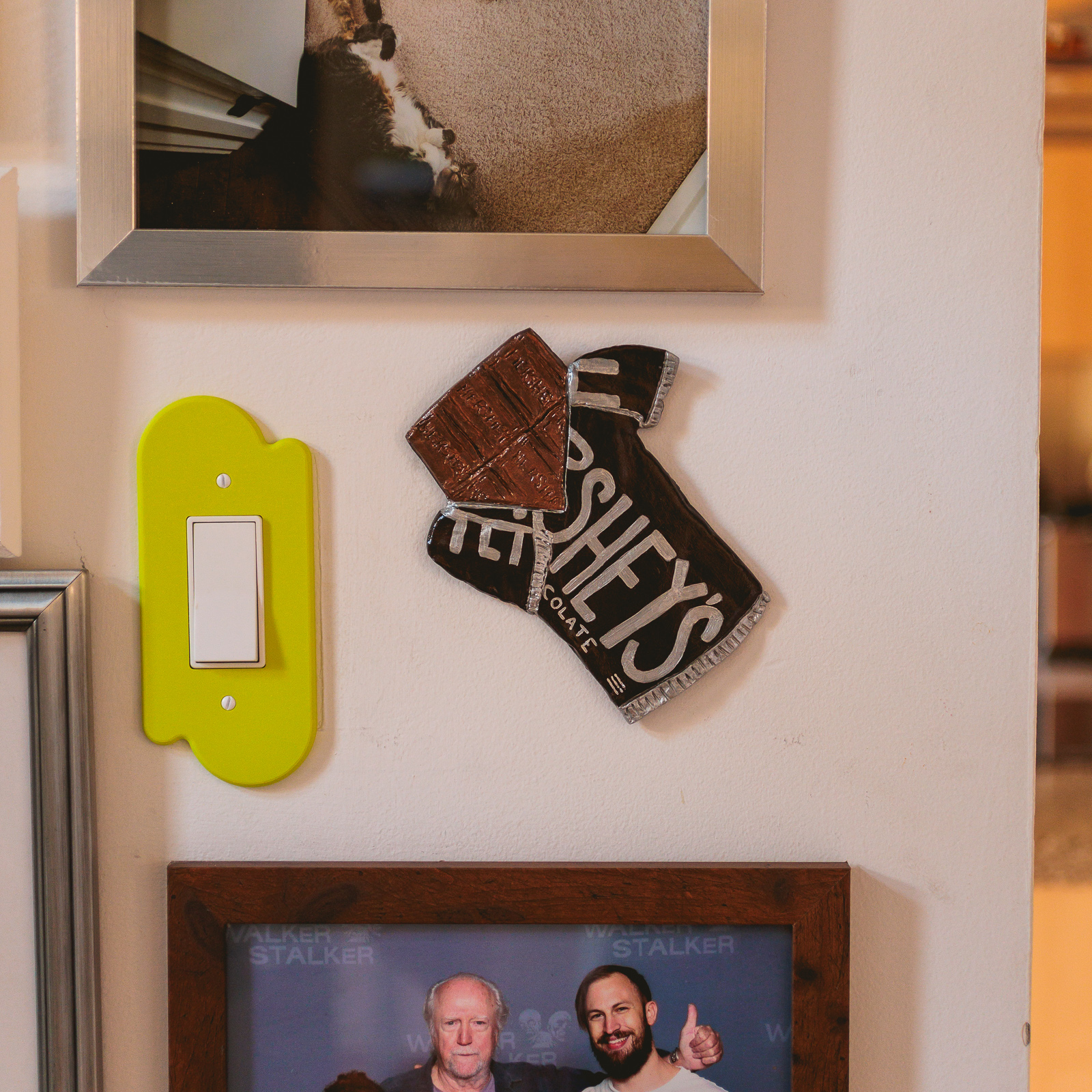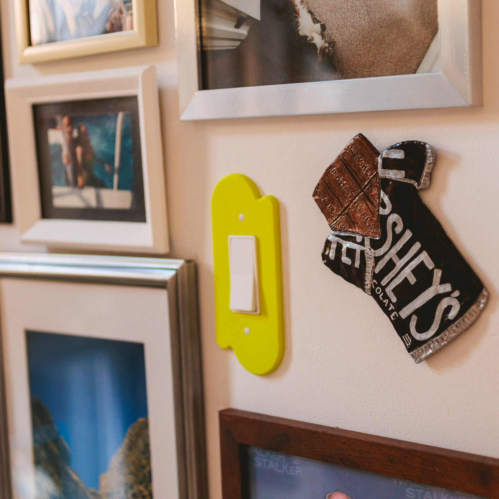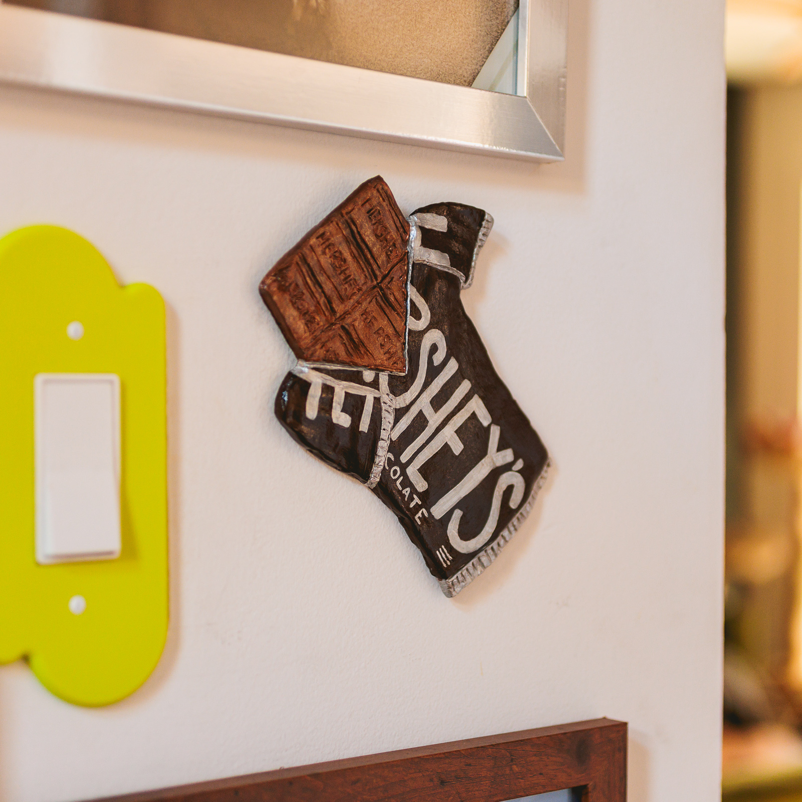 What is it: A tiny wall hanging of a half-opened Hershey’s chocolate bar. Approximately 6.5″ tall and 5.5″ wide. Hangs intentionally askew on the wall with a sawtooth hanger on the back.