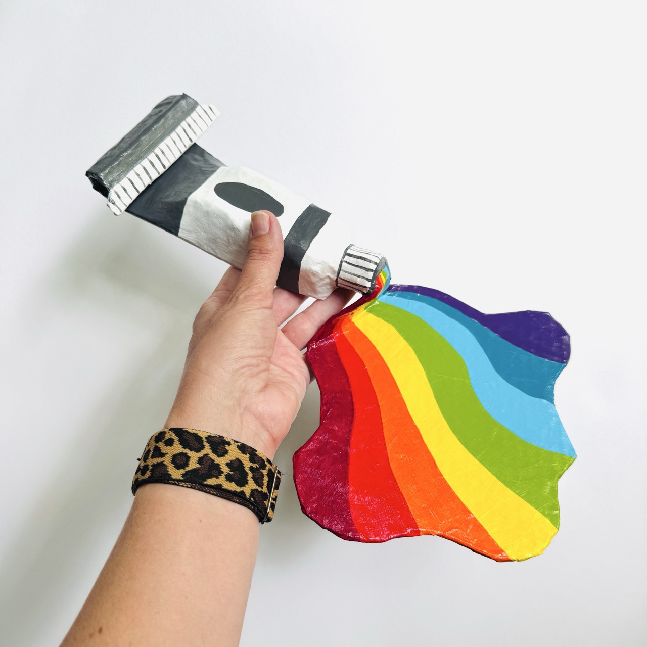 What is it: A paper mache wall hanging of a gray and white paint tube that’s full of rainbow paint. Ready to hang. Approximately 12.25″ tall and 7.5″ wide.