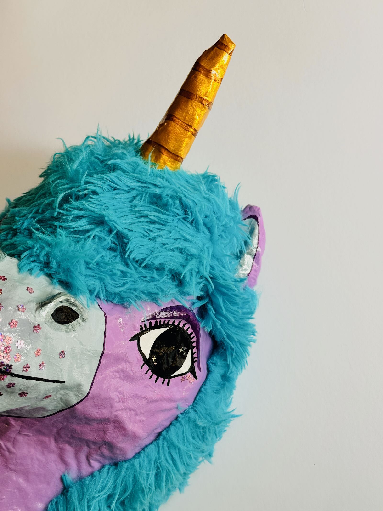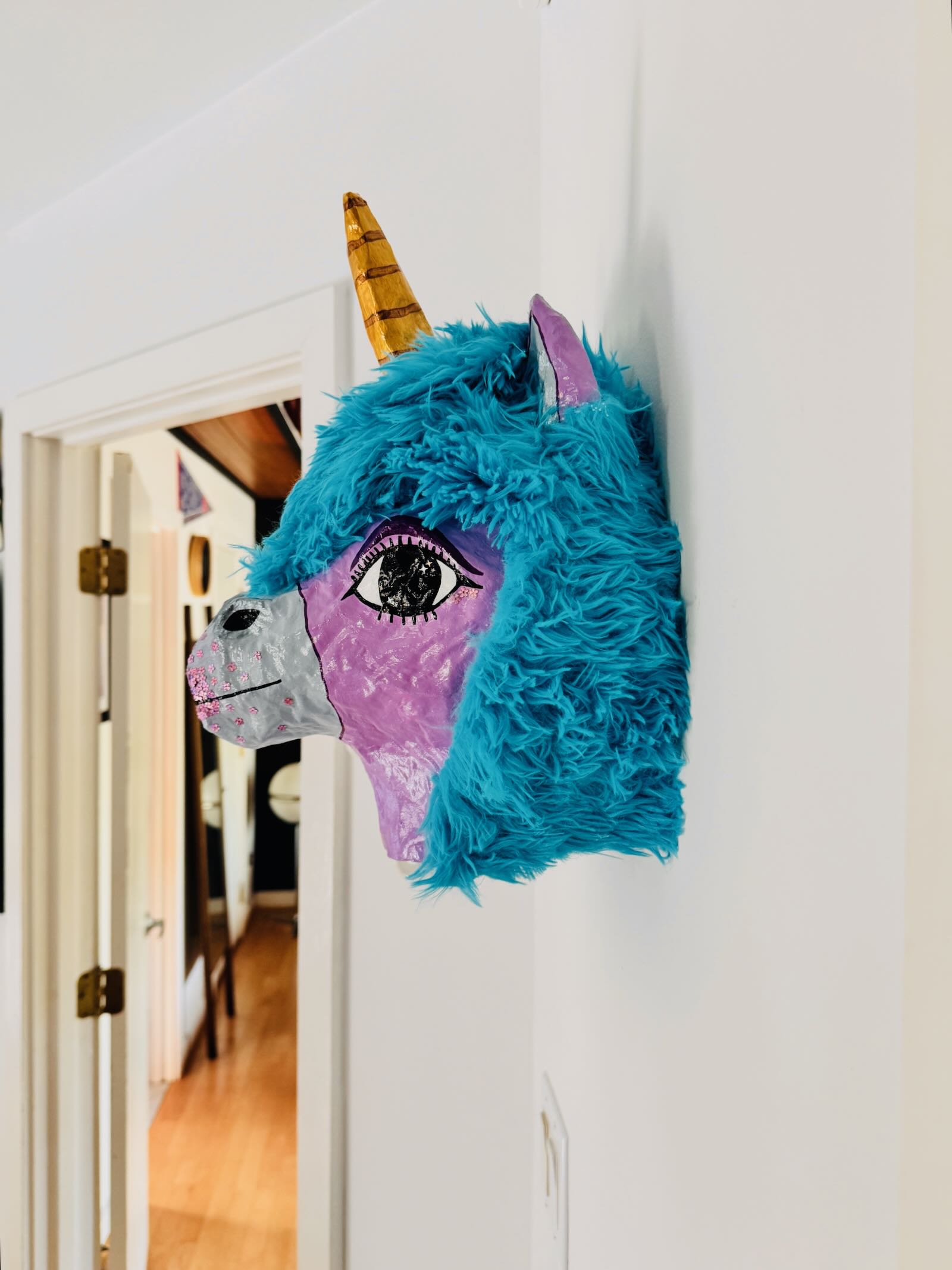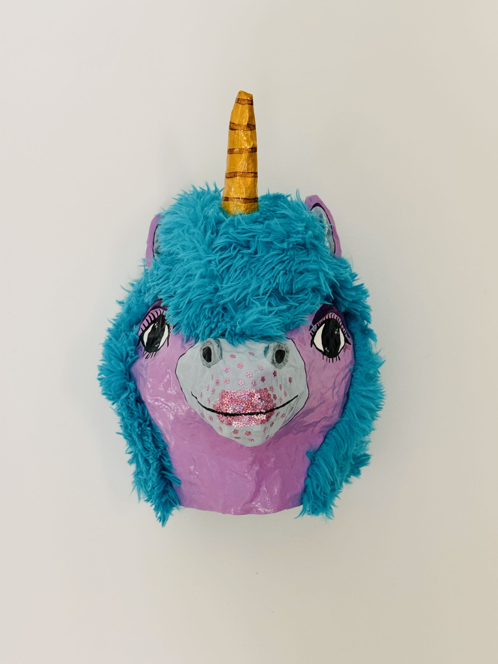 What is it: A paper-mache wall hanging of a unicorn head. Ready to hang (clay hanger built into the back, will need screw or very long, secure nail). Approximately 10″ wide and 15.5″ tall.