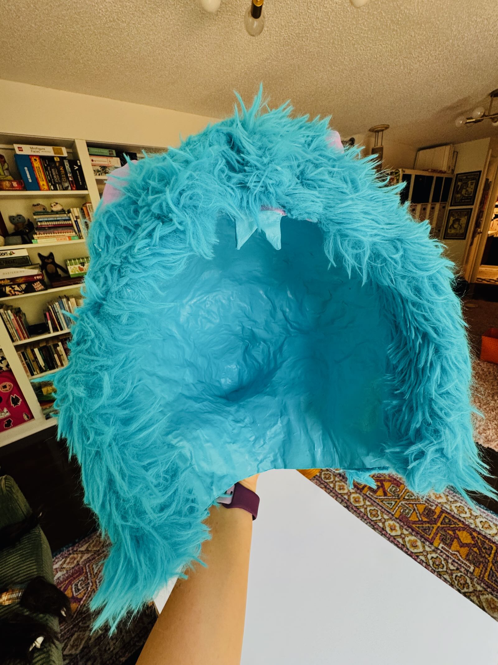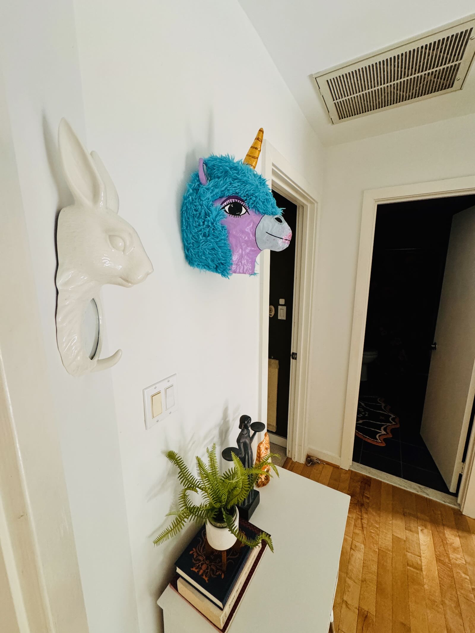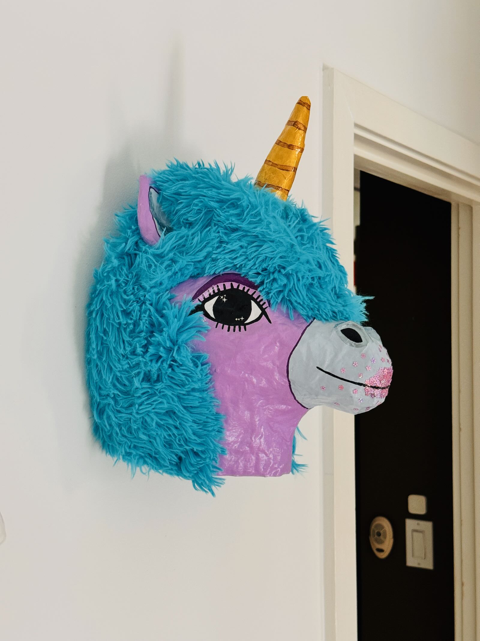 What is it: A paper-mache wall hanging of a unicorn head. Ready to hang (clay hanger built into the back, will need screw or very long, secure nail). Approximately 10″ wide and 15.5″ tall.