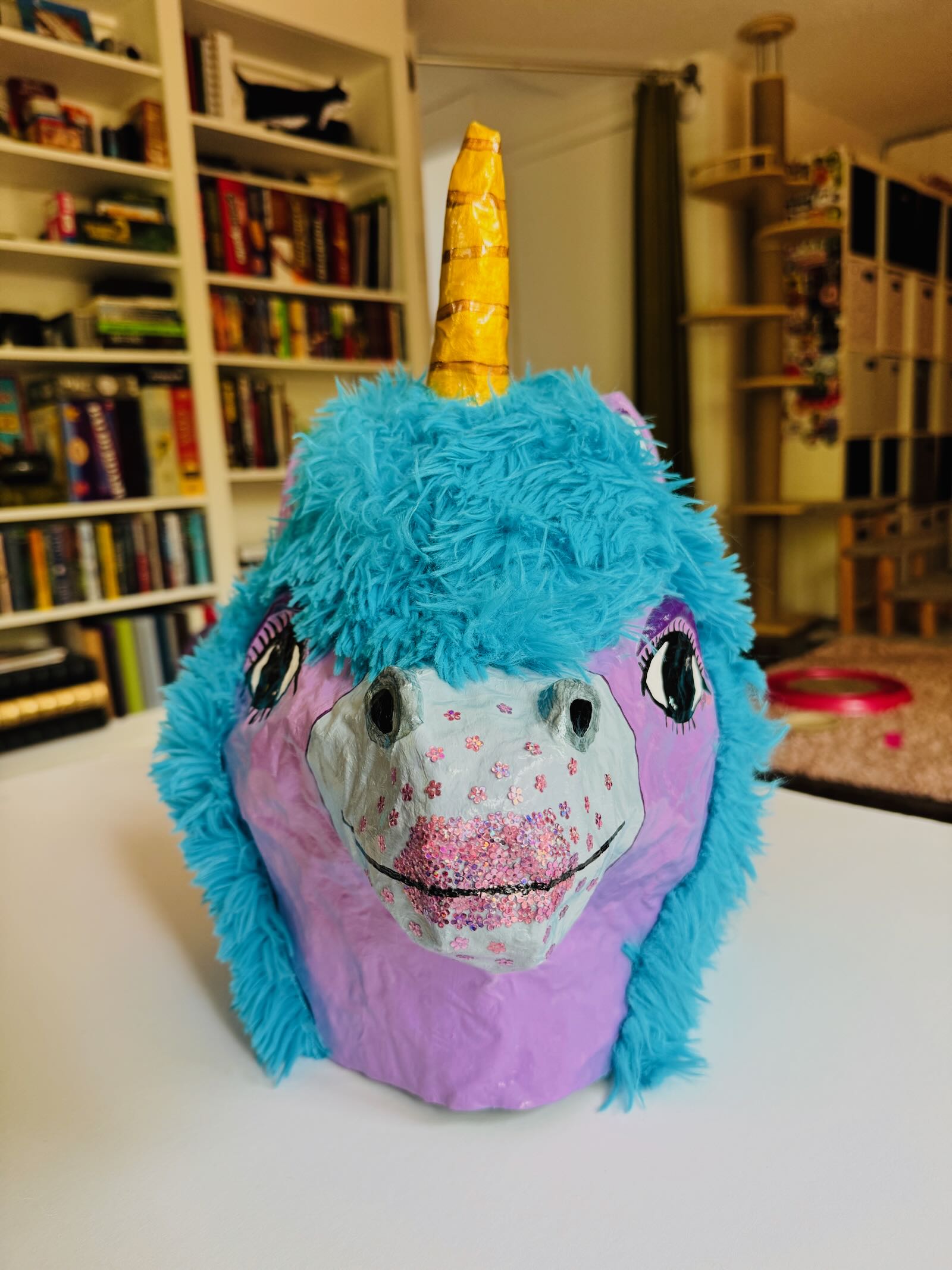 This is a paper-mache sculpture, handmade by me. All my sculptures are one-of-a-kind and contain little imperfections and an attitude of their own. Guaranteed 100% to not make you cry like The Last Unicorn did. Thanks for supporting a small artist and helping to feed my cats.