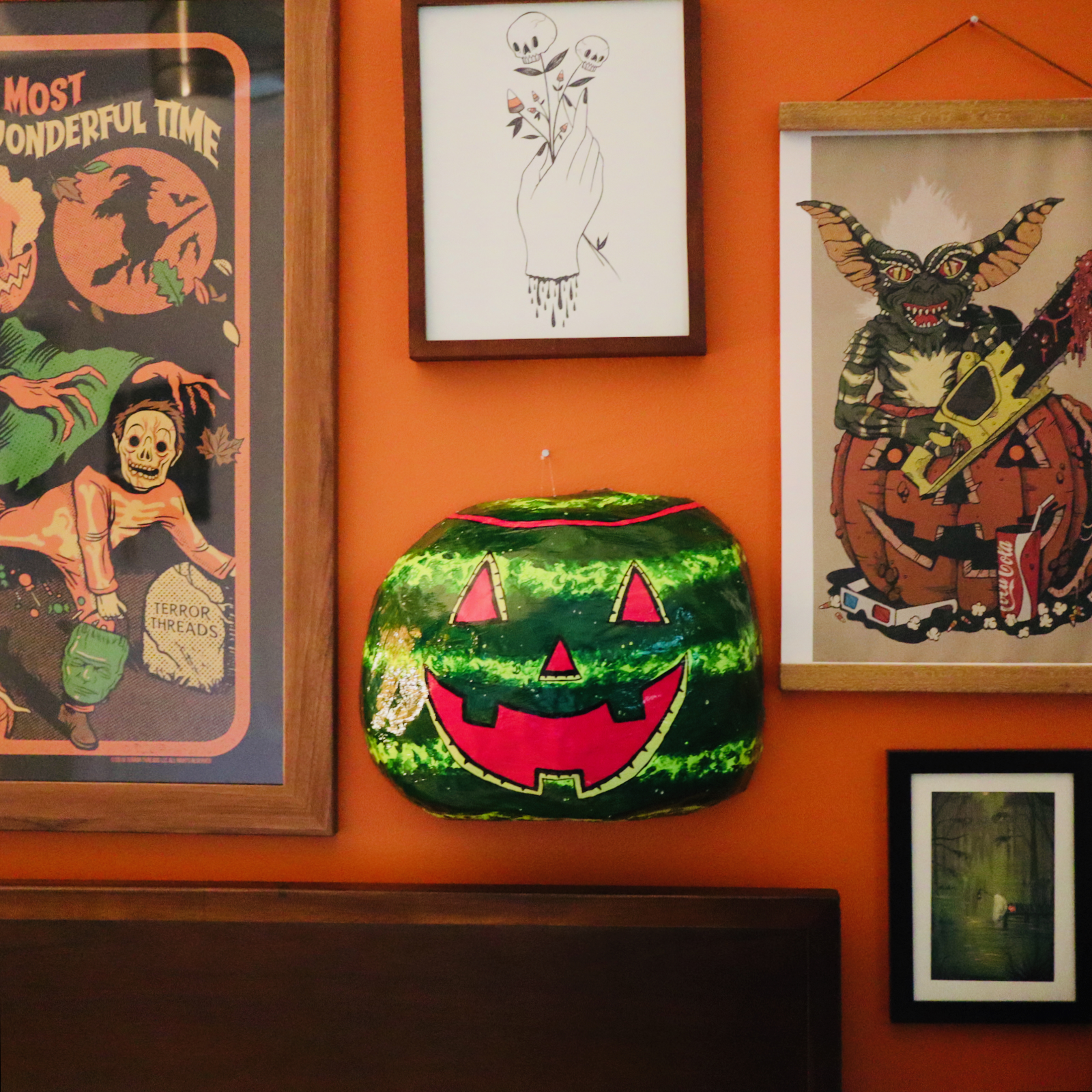 What is it: A paper mache wall sculpture of a watermelon jack-o-lantern. Ready to hang. About 12″wide and 9.5″ tall.