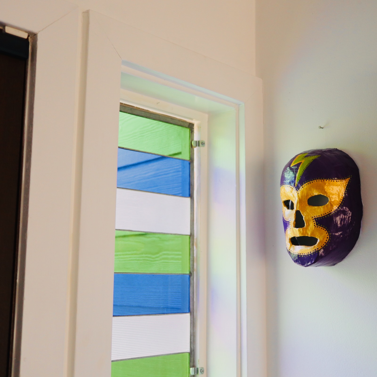 What is it: A paper-mache sculpture of a Luchador mask. Ready to hang. About 6″ wide (at widest) and 8″ long.